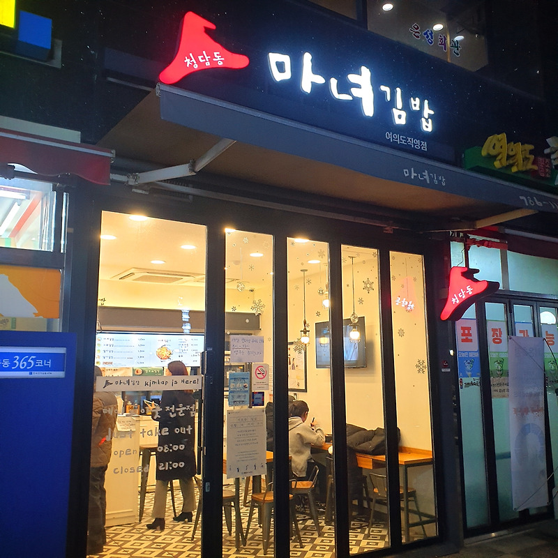 여의도 일대 김밥집은 다 다녀 봤어요. '생활의 달인', '생방송 아침이 좋다'등에 소개된 중독성 강한 김밥으로 수 많은 연예인들이 직접 방문하여 맛을 인정한 청담동 마녀김밥의 직영점입니다. 영등포구 여의대방로 65길 12 전화: 진짜 그 뒤론 다른 김밥 안 먹습니다ㅎㅎ. 2층에 은성회관이 있는 건물 1층 가게 옆 곱창집도 유명한 곳이다.